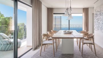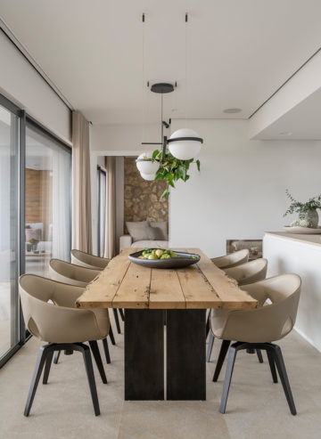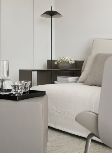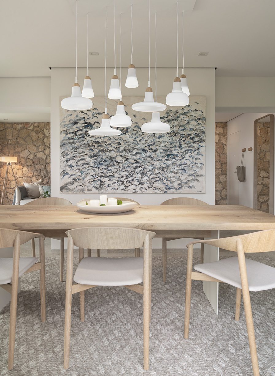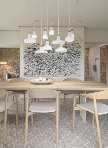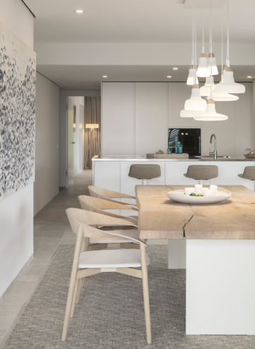 Diese Wohnung ermöglicht eine Reise zu den Ursprüngen mittels der Elemente Luft und Wasser. Die hellen, luftigen Innenräume sind mit Licht und einer erfrischenden Meeresbrise im ganzen Haus gefüllt. Hier fließt alles so, dass man Leichtigkeit, Ruhe, Gelassenheit und Entspannung verspürt. Bei der Auswahl der Möbel wurden optisch leichte Elemente bevorzugt, die den Raum nicht überladen, sondern ein Gefühl von Leichtigkeit vermitteln.