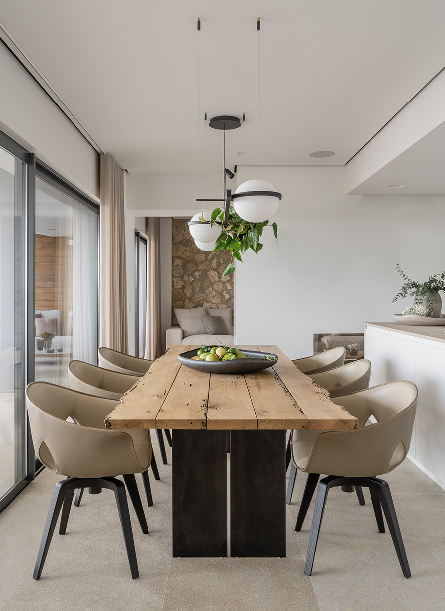 Zur Unterstützung des Konzepts der Harmonie und des fließenden Übergangs werden die Elemente der Erde in Form eines neutralen, eleganten Farbschemas eingeführt, das von der Essenz der Insel inspiriert ist. Das Farbschema vereint Materialien und Texturen, die entlang linearer Formen und harmonischer Elemente sowohl im Innen- als auch im Außenbereich eingesetzt werden. Eine raffinierte Leuchte, eine moderne Darstellung des Feuerelements, vermittelt wiederum das Gefühl von Wärme und Zusammengehörigkeit.