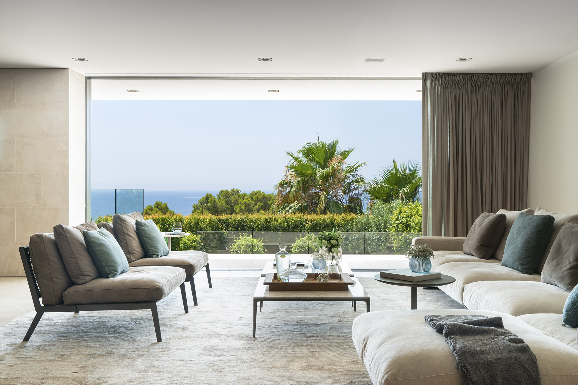 um durch abwechslungsreiche Materialkombinationen, Stoffe, Leder, Marmor und Holz, in neutral gehaltener Farbgebung die herrliche Architektur und den prachtvollen Meerblick gebührend zur Geltung zu bringen. Das behagliche Gefühl, das mit Projekt M14 entstand, ist allgegenwärtig und bietet den Bewohnern ein zugleich komfortables und elegantes Zuhause.