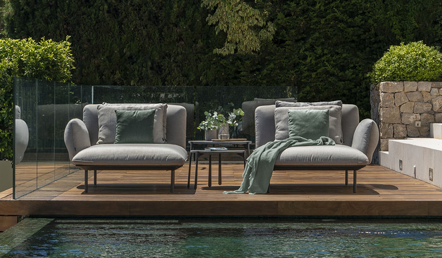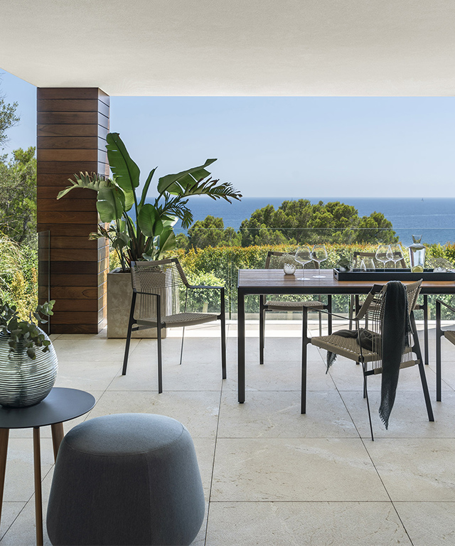 Im Außenbereich spiegeln mit Leinen bezogene Polster, schlichte und schnittige Möbelstücke und Outdoor-Zubehör die Schönheit und Reinheit der Umgebung wider. Mit zeitgemäßer Raffinesse, für die Terraza Balear bekannt ist, wird die unverbaute Aussicht optimal genutzt.